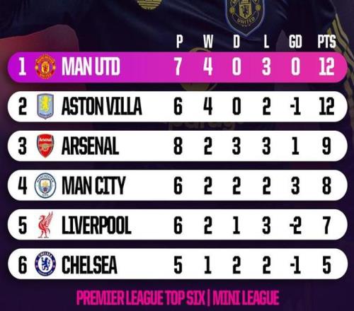統(tǒng)計表明,英超積分榜前六名組成的小循環(huán)中,曼聯(lián)7場得到12分,高居第一,阿森納8場只有9分,強強對話的能力遭到質疑,阿斯頓維拉很不錯,6場就拿到12分,是排名很高的重要因素。從另外一個角度看,曼聯(lián)面對非前六名的球隊,16場只得26分,場均只有1.63分,比強強對話的場均1.71分還要低。
