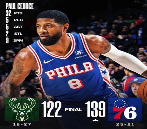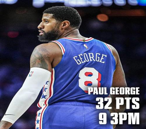 在本場之前,喬治本賽季一共為76人打了25場比賽,場均上場30.2分鐘,只能得到15.4分5.3籃板3.6助攻,三項命中率41.5%/36.4%/86.5%,真實命中率54.8%。