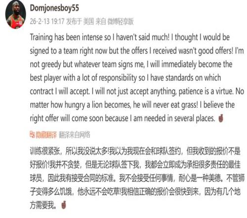 到目前為止,瓊斯都沒有獲得一份合同。其實在過去一段時間,瓊斯在NBL打球,后續(xù)回到美國養(yǎng)傷。無奈這波養(yǎng)傷之后,瓊斯并沒有回歸到CBA。根據他曝光的動態(tài)來看:我以為我現(xiàn)在會和球隊簽約,但我收到的報價不是好報價!這樣的話語已經非常明顯了,他之所以沒有回到CBA,就是因為薪資沒有到位,所以他始終都沒有談妥。