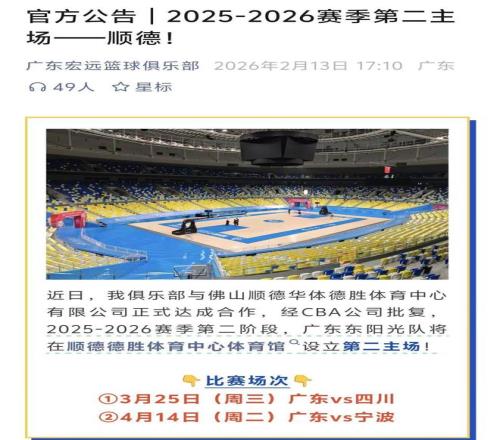 根據(jù)廣東宏遠(yuǎn)籃球俱樂部發(fā)布的消息,在常規(guī)賽第二階段他們將啟用本賽季的第二個主場,順德德勝體育中心體育館,本賽季廣東隊在這個球館的比賽只有兩場,分別是3月25日廣東主場對陣四川隊的比賽,以及4月14日廣東對陣寧波隊的比賽,其余的主場比賽依舊在東莞東風(fēng)日產(chǎn)問文體中心體育館。